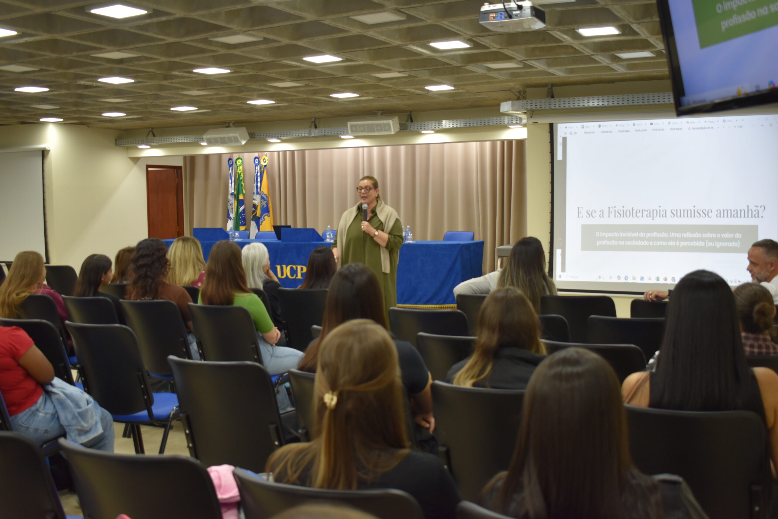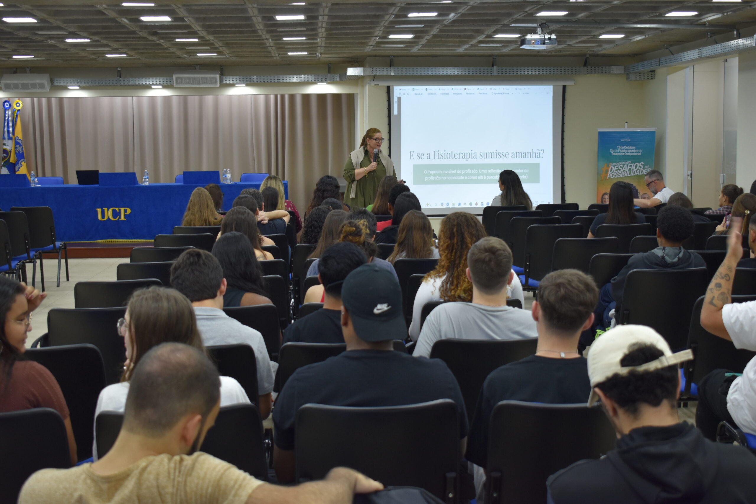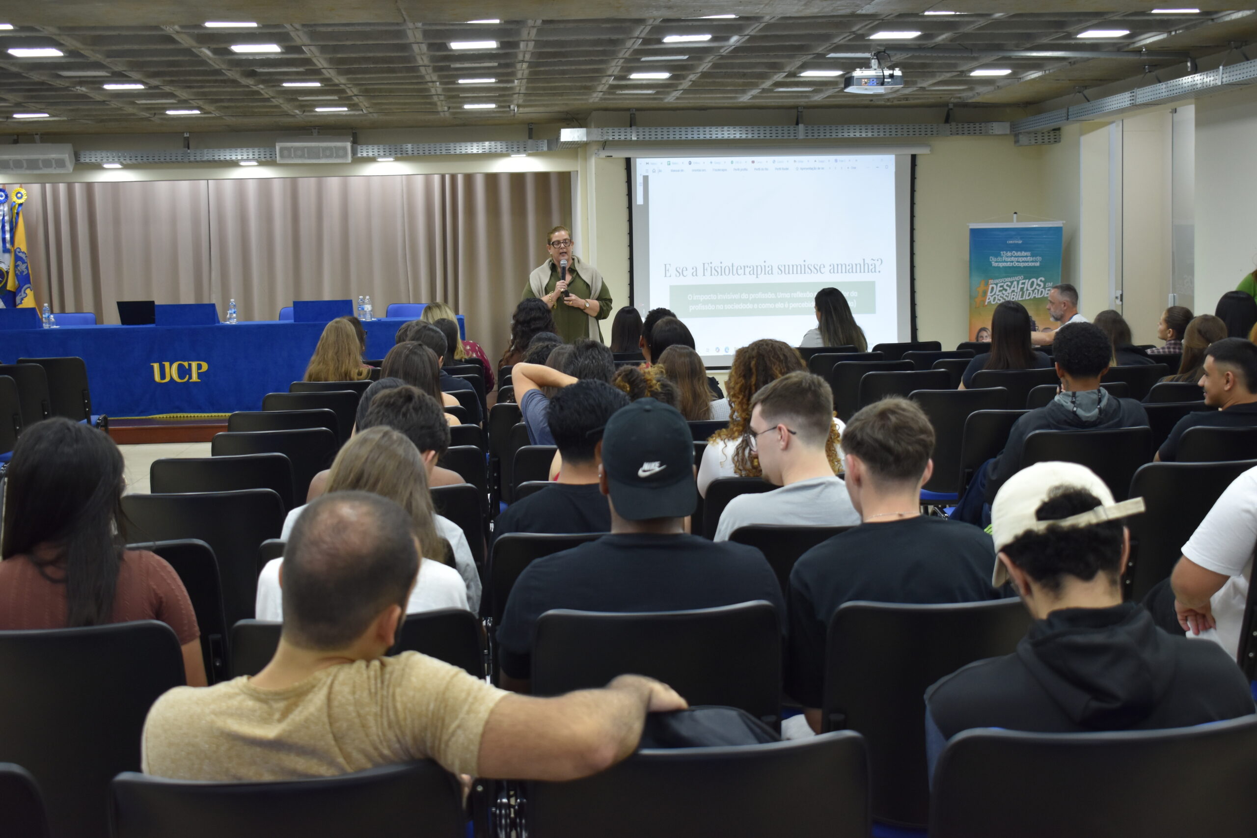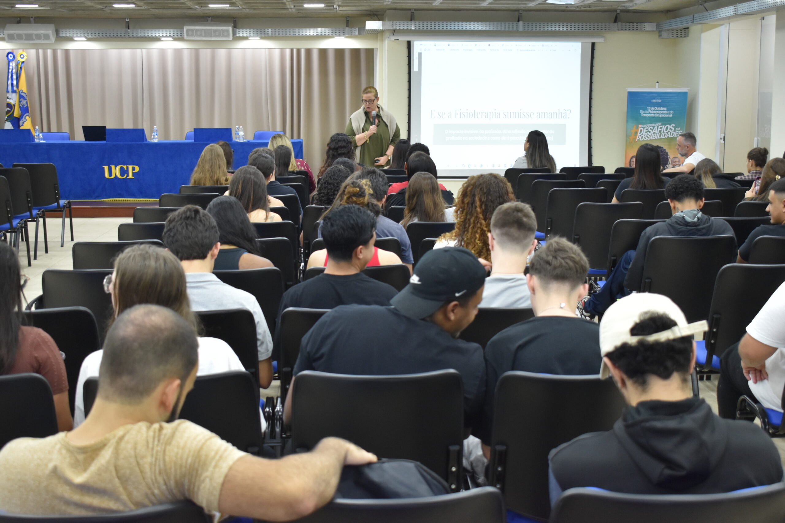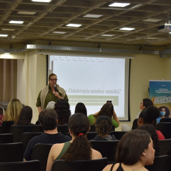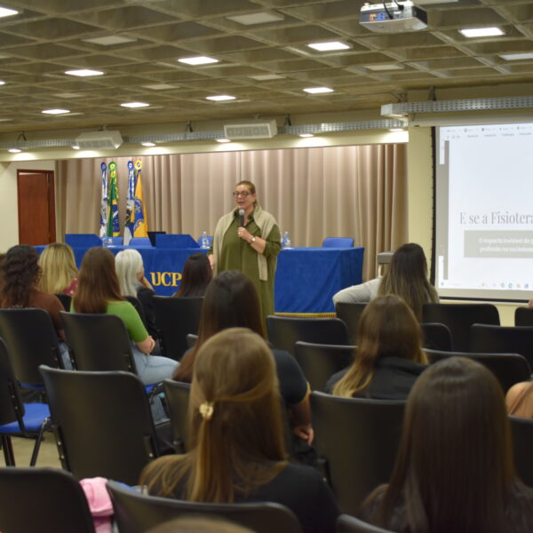 Comemorado na última segunda-feira (13.10), o Dia do Fisioterapeuta, na UCP, foi celebrado com uma reflexão e exaltando a importância da profissão. O curso de Fisioterapia promoveu o bate-papo E se a Fisioterapia sumisse amanhã? Uma reflexão sobre o valor da profissão na sociedade, que aconteceu no Auditório 3 do Campus Dom Cintra. O evento recebeu as fisioterapeutas Alessandra Belerique, coordenadora do SADI Petrópolis, e Flaviane Marinho, representante do CREFITO-2 em Petrópolis.