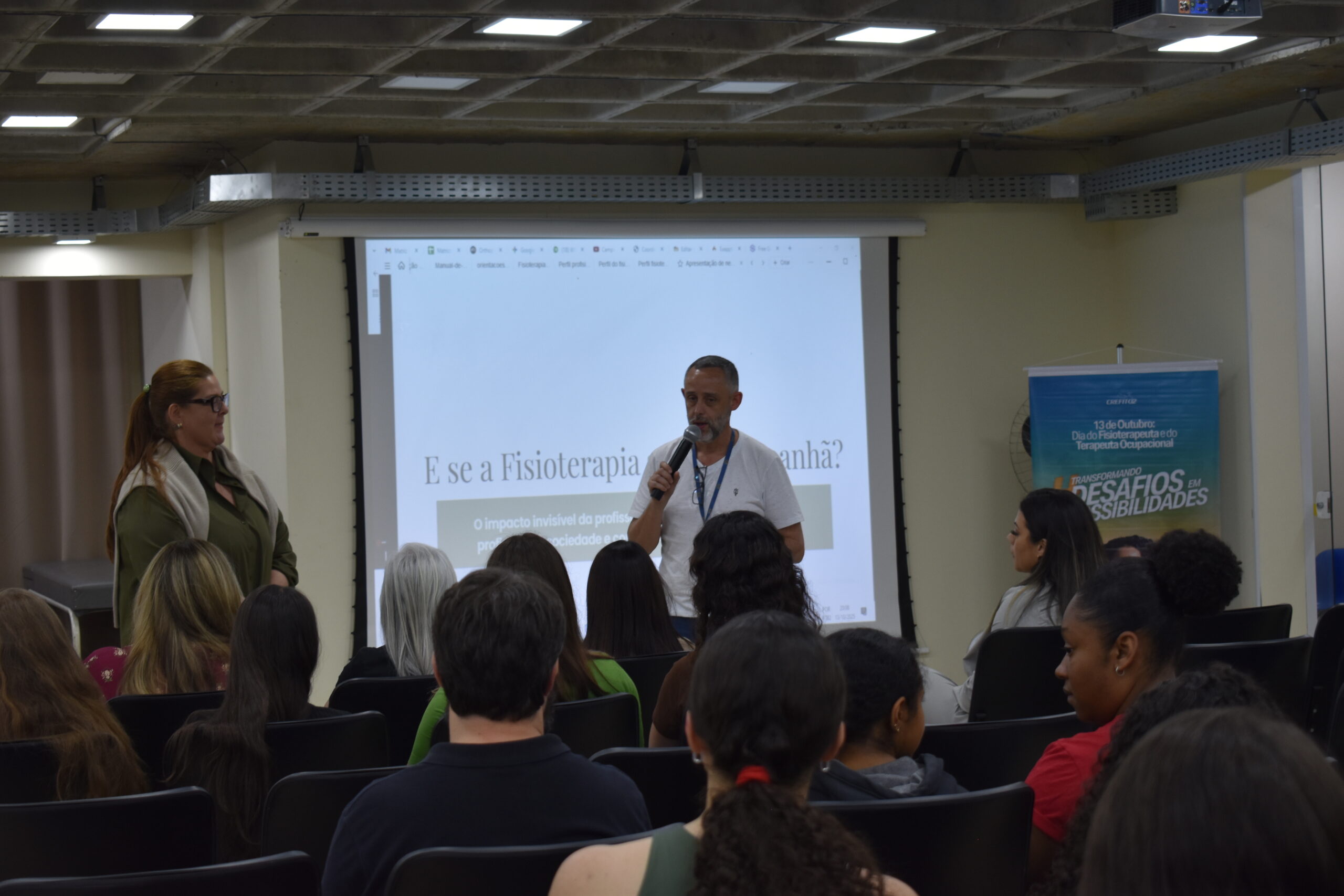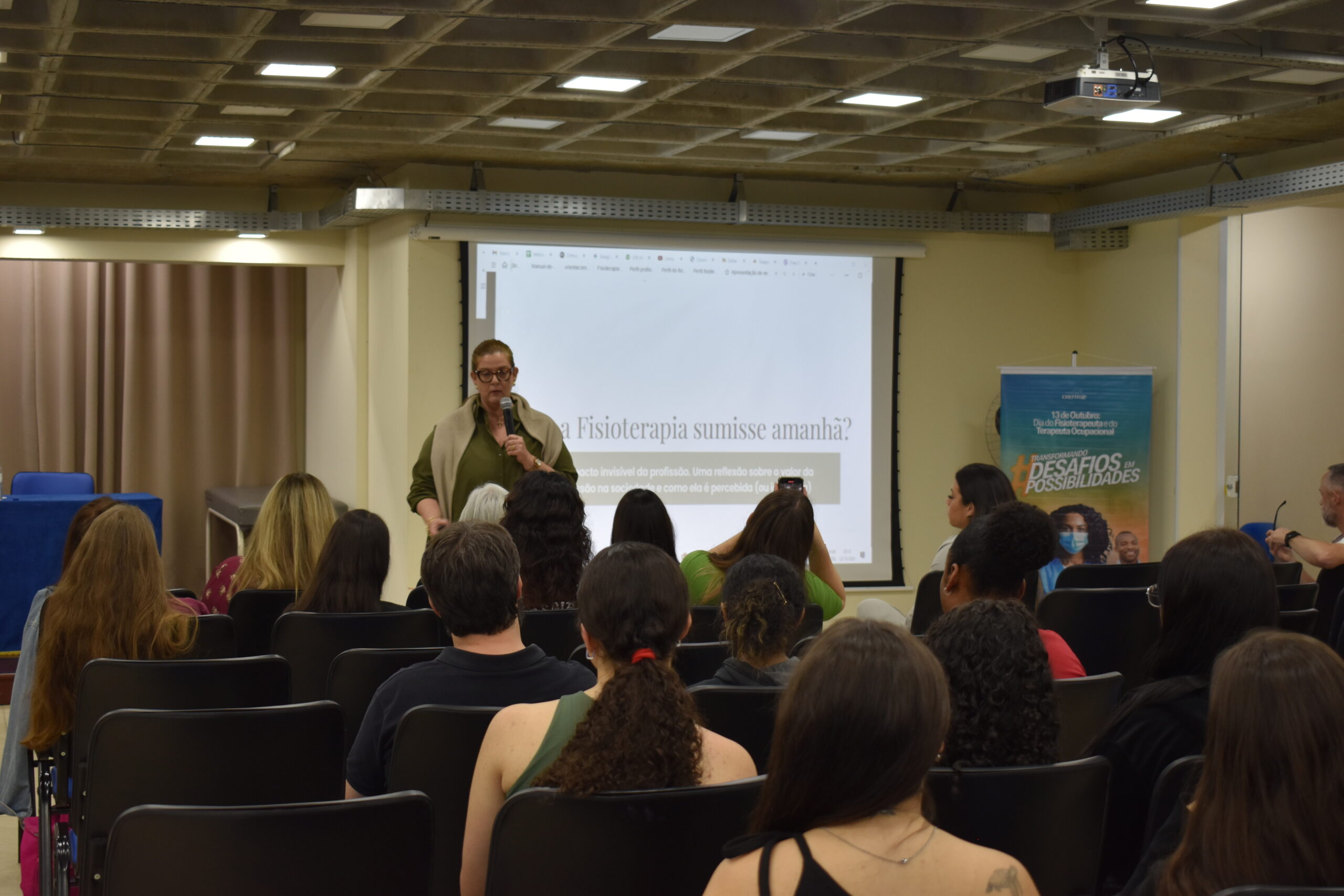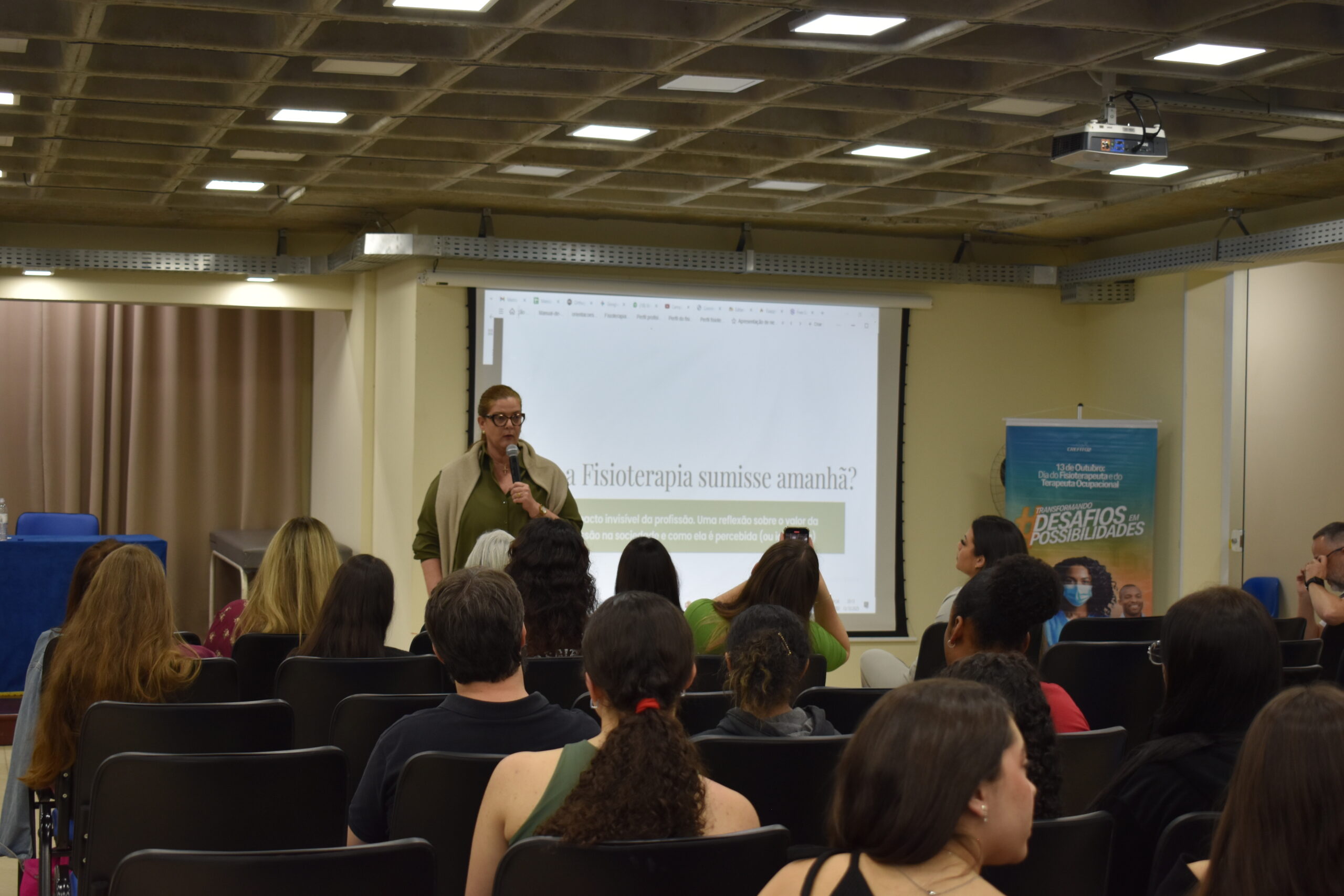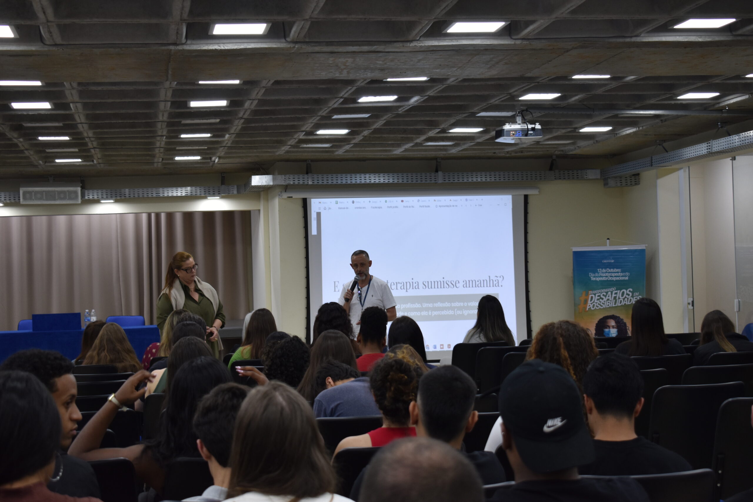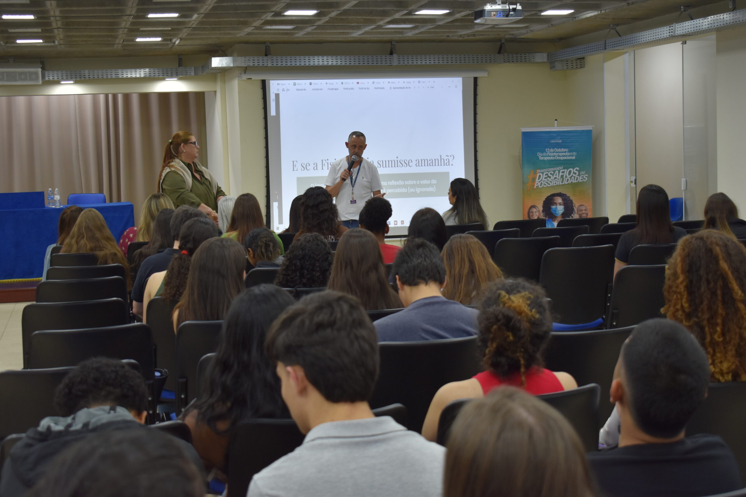 Comemorado na última segunda-feira (13.10), o Dia do Fisioterapeuta, na UCP, foi celebrado com uma reflexão e exaltando a importância da profissão. O curso de Fisioterapia promoveu o bate-papo E se a Fisioterapia sumisse amanhã? Uma reflexão sobre o valor da profissão na sociedade, que aconteceu no Auditório 3 do Campus Dom Cintra. O evento recebeu as fisioterapeutas Alessandra Belerique, coordenadora do SADI Petrópolis, e Flaviane Marinho, representante do CREFITO-2 em Petrópolis.